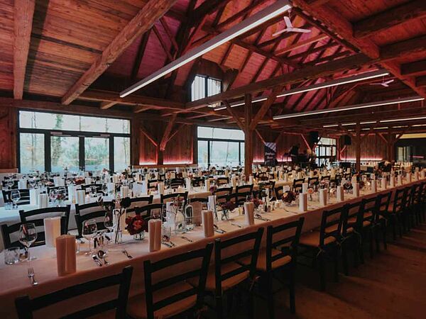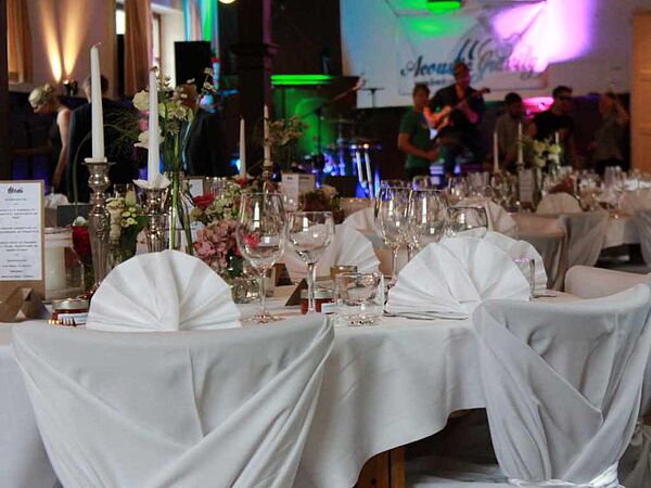 Der Saal mit Bühne bietet großzügig Platz für große Gesellschaften und lädt bei einem fantastischen Menü zu ausgelassenen Feiern ein.